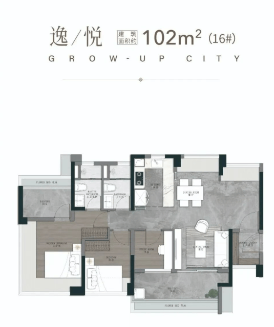 103㎡四空间两卫:这是三代同堂家庭的换房必看户型。阳光入户,五开间设计带来了约14米的惊人采光面。开放式厨房设计让家庭互动更加频繁。270°无立柱转角阳台,视野开阔无阻。此外,还特别设计了阳光梳妆台和独立衣帽间,细节之处尽显人性化关怀。