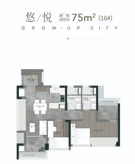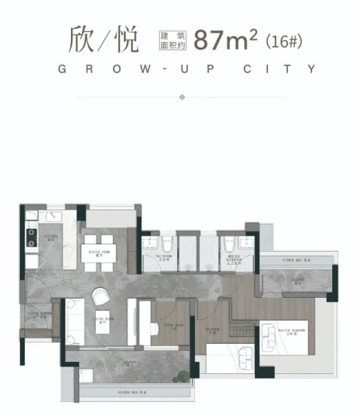 76㎡三空间两卫:这是专为年轻人量身定制的主城上车首选。虽然面积紧凑,但设计极其精妙。四开间朝南的布局,让客厅和两个卧室都能沐浴在阳光下。全明转角玄关设计,增加了收纳空间的同时也提升了归家的仪式感。开放式厨房与餐厅相连,拓宽了视觉空间。开阔的景观阳台实现了南北对流,主卧更配备了衣帽间,功能齐全,完全满足年轻夫妇或单身贵族的品质生活需求。