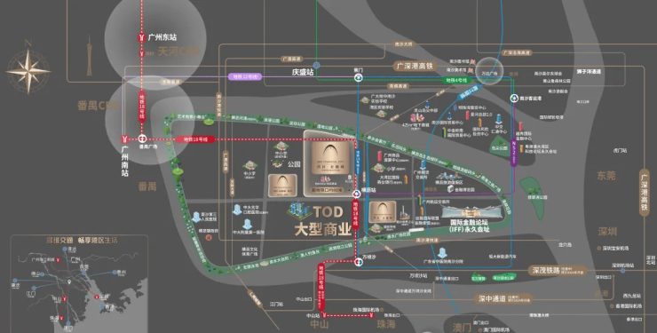 商业:除社区底商外,项目南向仅50米即横沥TOD商业综合体(规划建面约40万㎡),将建设超甲级写字楼、五星级酒店、高端购物中心,未来将成为南沙最高端的商业地标。