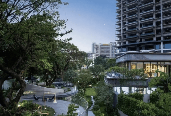 答:“浮岛”设计(整体抬高)有效隔离了主干道的噪音与尘埃,提升了社区私密性与静谧感。“立体花园” 通过地面园林、架空层绿化、垂直绿墙等多层次设计,最大化绿视率,打造了约9000㎡的沉浸式绿色空间,实现了“花园中建房子”的理念。