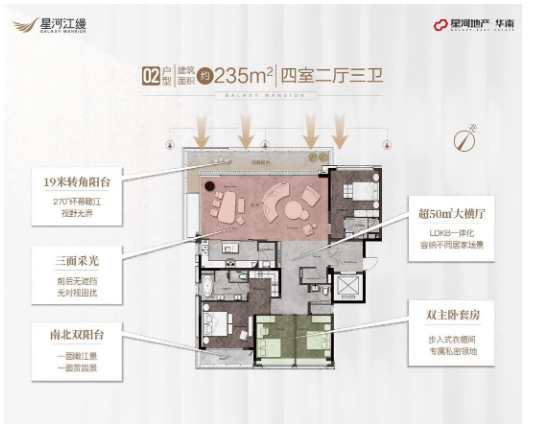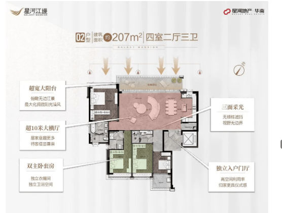 星河江缦在售户型均为大平层设计,主打179-235㎡四房户型,纯板式设计,专梯专户,双套房配置,整体户型方正、南北通透,采光通风俱佳,空间阔绰,适配高端改善、刚需改善等多种置业需求,圈层纯粹,彰显居住品味。