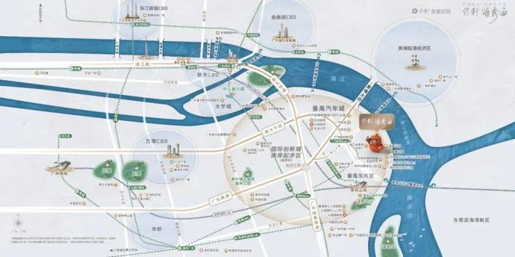 保利领秀海紧邻南大干线经济带,距南大干线仅750米,25分钟直达琶洲;规划中的地铁8号线东延段(莲花山站约2.4公里)预计2027年底通车,全程8站,20分钟直达海珠;佛莞城轨已开通,穗莞深琶洲支线(规划中)将进一步强化区域联通性。自驾方面,25分钟覆盖珠江新城、万博CBD,30分钟通达广州南站。