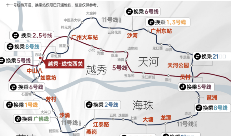 项目地理位置优越,距离5号线+13号线西场站步行约900米,距离5号线+11号线中山八站约1公里,实现双地铁覆盖和高效换乘。地铁11号线作为广州首条环线,可直达白鹅潭、海珠西、中大、琶洲、天河公园、天河北及广州东站,为日常通勤提供极大便利。