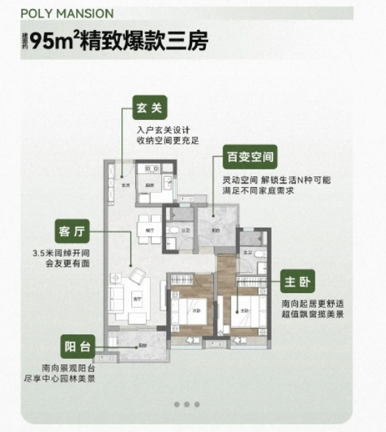 项目的主力户型包括建面约95㎡三房、建面约125-130㎡四房,以及建面约138㎡四房双主套,涵盖了刚需、改善等多种需求,每一款户型都经过精心设计,兼顾实用性与舒适性。其中,建面约95㎡三房户型,是刚需家庭的优选之作,户型格局方正,全南向设计,采光充足、通风俱佳,客厅连接宽阔阳台,既能保证室内的采光与通风,也能为业主提供一个休闲观景的空间;三个卧室布局合理,空间大小适中,能够满足一家三口的居住需求,主卧自带飘窗,增加了空间的实用性与舒适性,次卧与书房可灵活改造,满足家庭的多样化需求;厨房采用L型设计,操作空间充足,动线合理,让烹饪变得更加轻松便捷;卫生间干湿分离,避免了潮湿困扰,提升了使用的舒适度。