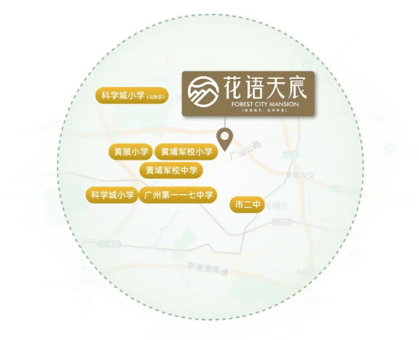 A: 项目配建有“森林学堂”主题幼儿园。义务教育阶段的小学和中学位于项目外部,需根据黄埔区教育局当年的招生政策进行统筹摇号。从地理位置看,黄埔军校中小学和科学城实验小学(原黄陂小学)距离项目最近,直线距离约800米,过往经验显示业主子女入读这两所学校的概率较大,但具体结果仍以官方当年发布的文件为准。