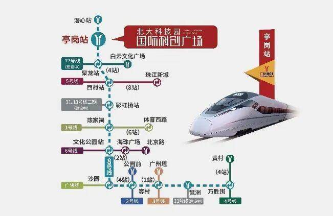 项目所在的白云湖数字科技城核心区,是广州北部新兴的科技创新高地。北大科技园国际科创广场紧邻白云湖,西侧即为地铁亭岗站,交通便捷。项目周边形成“四横四纵”的路网格局,快速通达华南快速路、许广高速及机场高速,毗邻机场快线直通白云机场,实现高效衔接国内外商务活动。地铁8号线亭岗站上盖地铁,约300米即达,途经13个换乘点,30分钟可到达陈家祠、文化公园、乐峰广场及荔湾、越秀、海珠等核心区域,同时接驳1至7号线及广佛线,并与规划中的10至20号线形成北部城际交通枢纽,打造覆盖粤港澳的高效商务圈。