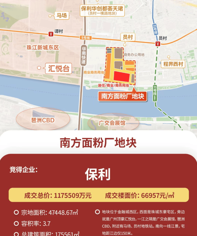 保利南方面粉厂地块项目位于广州天河区金融西区,紧邻临江大道。该项目占地面积为5.6万平方米,总建筑面积达到17.55万平方米,容积率为3.7,绿化率为35%。建筑布局采用围合式设计,共包含6栋楼,户型面积段从205平方米到630平方米不等,主要分为前排望江和后排高楼层两种类型。此外,项目还自带5000平方米的商业空间。