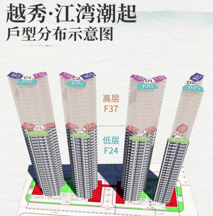 高区户型:25 - 37 层,两梯三户,有建面约 135、160、195 平户型 。建面约 135㎡户型南北对流,四开间朝南,采光面约 16.6 米,兼具园景与江景;建面约 160㎡户型五开间朝南,一体化巨幕客厅,南北双阳台,南向双套房;建面约 195 平户型,阳台长度约 8 米,LDK 客餐厅面积约 70 方,两侧观江面长达约 16 米,空间感十足。