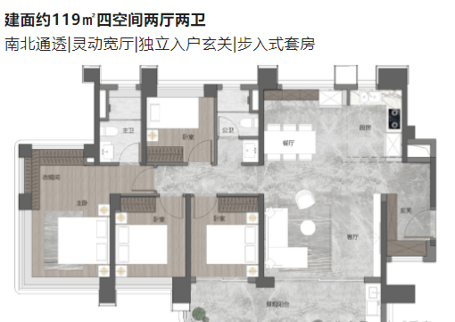 低区户型:3 - 23 层,两梯四户,有建面约 96、119 平户型 。如建面 95㎡四房,南向可观江景,主卧 270° 环幕大飘窗,最大化采光与景观视野;建面约 119㎡户型,南北通透,拥有灵动宽厅、独立入户玄关与步入式套房。