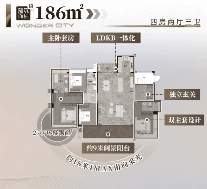 其中,建面约105㎡四房 总价仅480–520万,做到四开间朝南、南北通透,主卧套房带独立卫浴,动静分区清晰,二胎家庭亦不显局促;建面约141㎡四房 总价620万起(原价670万),客厅开间阔绰,全景飘窗引入充足采光,过道零浪费,空间利用率极高;建面约186㎡四房 则以舒展格局、大尺度景观窗、灵活功能区划,满足高端改善人群对私密性与仪式感的极致追求。