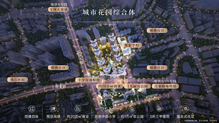 交通配套: 地铁 2/8/11 号线三线交汇,步行约 400 米可达 8 号线宝岗大道站,900 米可达 2 号线与 8 号线交汇的昌岗站,半小时通勤圈覆盖中大、琶洲、珠江新城等核心商务区,未来还规划有 24 号线,四地铁配置使其成为“打工人救星”。