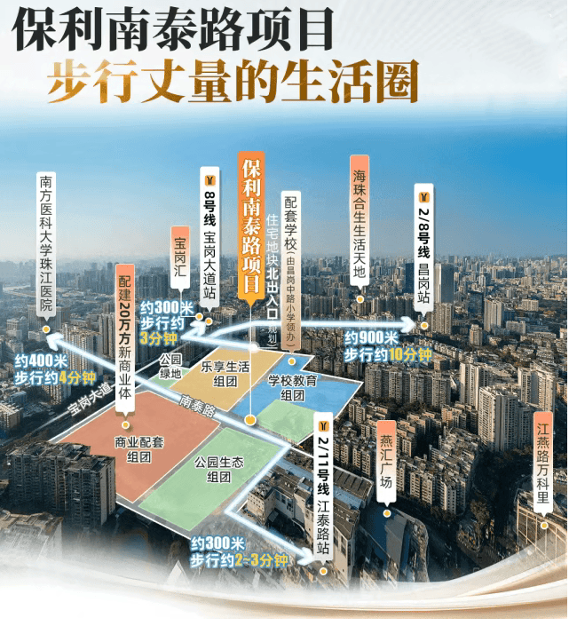 项目自带约 20 万㎡商业综合体,将由保利配建,打造海珠西部最大、最新一代的商业地标。沿南泰路直行约 400 米,即可到达超大型三甲医院——南方医科大学珠江医院。此外,周边 500 米范围内还有江燕路万科里、燕汇广场等成熟商业体,日常购物、餐饮、休闲、娱乐一站式搞定。