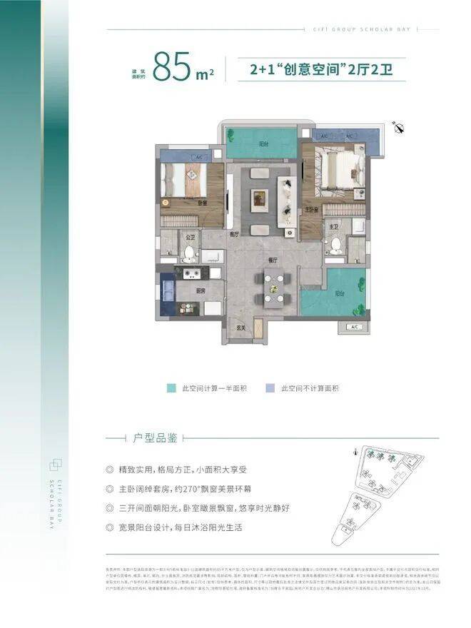 85㎡户型:精致实用,格局方正,三开间向阳,卧室瞰景飘窗,宽景阳台尽享阳光。主卧阔绰套房搭配约270°飘窗,美景环幕。