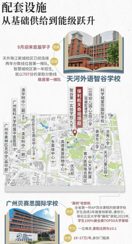 中小学:官宣就读天河外国语智谷学校,涵盖小学至中学教育阶段,距离项目不远,接送方便。