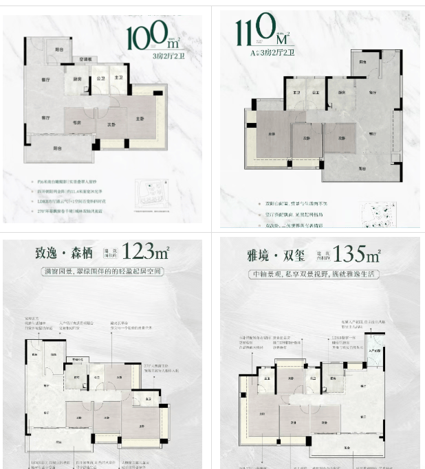 项目在售户型丰富,覆盖刚需与刚改全家庭需求。盛世锦城主力户型为建面约 98-139㎡3+1 至 4+1 房,余荫溪谷则推出建面约 150-175㎡院境低密真洋房,三期玖璋新品加推建面约 95-135㎡5 空间灵动户型,超高可用率,空间布局灵动,实现家庭融合且相互独立。