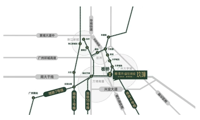 答:项目位于广州番禺万博 CBD 东侧,地铁 7 号线板桥站直线距离约 500 米,步行可达;出门即上南大干线,2 站万博、1 站大学城、5 站琶洲、6 站珠江新城,多维交通畅达全城,出行非常便捷。