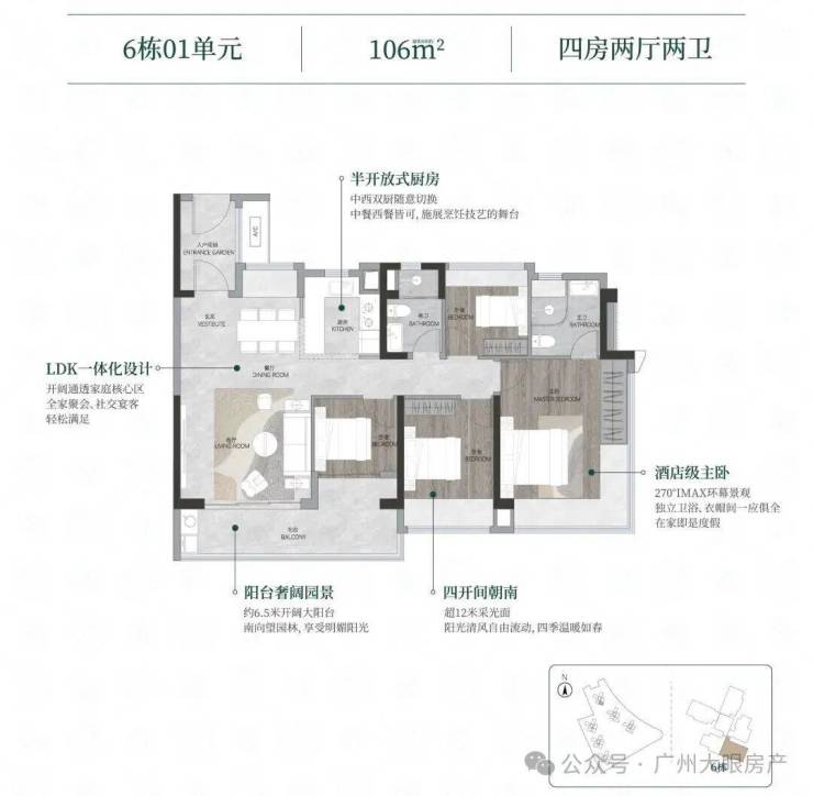 按照规划,项目商品房位于地块西侧,包括6栋层26-33层住宅,以T5风车型全南向户型规划布局,得房率基本超100%