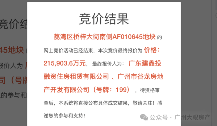 2023年4月,广东建工联合体以21.6亿底价竞得桥梓大街南侧地块,折合楼面价2.2万/平。