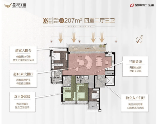 主力户型 179-235㎡四房,均为专梯专户、双套房设计,亮点纷呈:179㎡(1-3 栋),LDKB 一体化布局,超宽大阳台,三卫浴空间,高得房率;211㎡(4 栋),30 层高层南北望江,白天鹅楼栋尽收眼底,5 层以上为住宅,楼下配会所;207㎡(6-7 栋),纯板式结构,通风采光俱佳;235㎡(5 栋),距江仅 90 米,仅 30 套稀缺房源,江景视野最优。