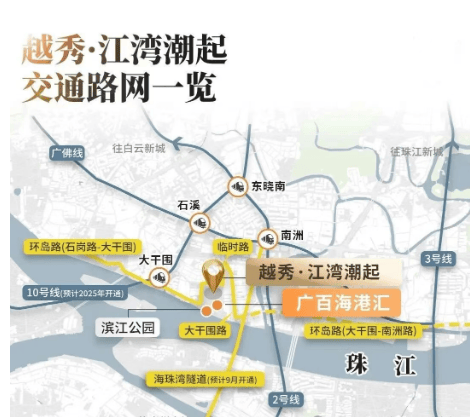 在建的海珠湾隧道预计今年开通,开通后从项目自驾至广州南站仅需 15 分钟,较目前缩短 20 分钟车程;项目门口的环岛路(石岗路 - 大干围路段)今年将开通临时道路,进一步提升板块通行效率。自驾方面,项目周边还有广州大道南、环城高速等交通主干道,实测从项目自驾至珠江新城约 25 分钟,至琶洲 CBD 约 20 分钟,至广州南站约 18 分钟(隧道开通后),多维交通网络满足业主日常出行需求。