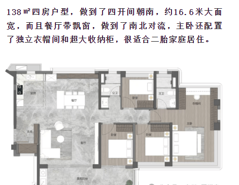 主力户型中,95㎡南向三房户型客餐厅与阳台开间达 5.6 米,可灵活改造成四房,主卧套房配备 270° 大飘窗,实测南向采光时长超 8 小时;138㎡四房户型做到四开间朝南,面宽约 16.6 米,餐厅带飘窗实现南北对流,主卧配备独立衣帽间与超大收纳柜,适配二胎家庭;195㎡大四房户型阳台长度约 8 米,LDK 客餐厅面积超 70㎡,两侧观江面总长约 16 米,江景视野极佳。此外,项目阳台占比达 20%,远超广州新规中阳台占比 15% 的上限,进一步提升居住舒适度。