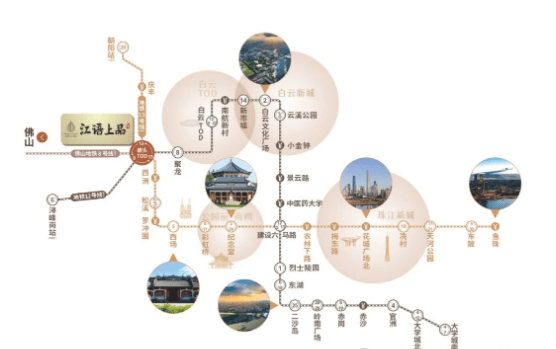轨道交通方面,项目坐拥三地铁交汇优势,出行便捷无忧。地铁12号线已通车,作为广州第一条无人驾驶地铁线路,可与十数条线路无缝换乘,直达大学城、白云文化广场等核心区域;地铁13号线二期西段预计2026年开通,串联白云、荔湾、越秀、天河四大主城区,6站可达纪念堂,直达珠江新城核心商圈;佛山地铁8号线(规划中)将实现广佛同城无缝衔接,进一步拓展出行半径。