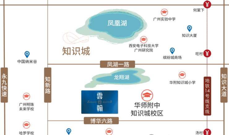 项目一路之隔即为华附知识城校区,直线仅100米,该学校是黄埔区截至目前投资规模最大、技术标准最高的学校,已于2023年正式招生。初中部采取自主招生+全区摇号的方式,业主子女有机会入读。此外,周边还有华附知识城小学、广东外语外贸大学知识城实验小学、凤凰湖小学、广州实验中学&小学、新侨中学等多所学校,满足不同年龄段孩子的教育需求。