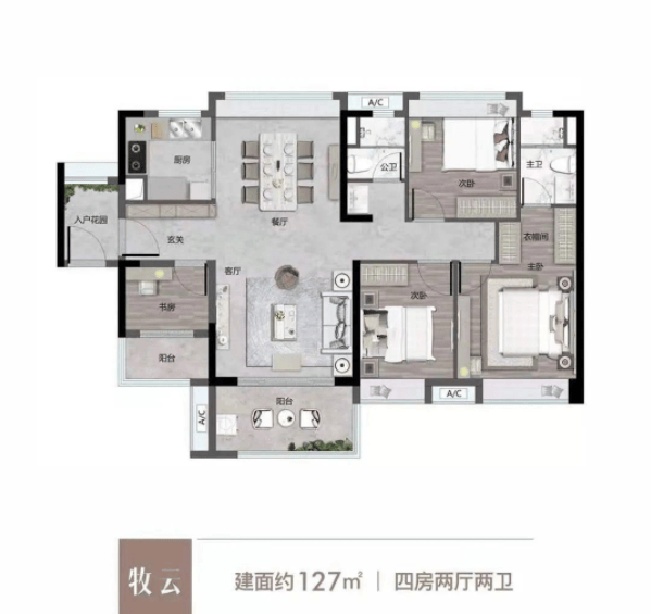 - 111㎡四房两卫:南向望湖,布局方正,总价约275万起,能满足二胎家庭的居住需求。四房设计可容纳一家四口的生活所需,主卧带独立卫生间和衣帽间,私密性强。南向阳台直面白云湖景,推窗就能欣赏湖光山色,居住体验极佳。