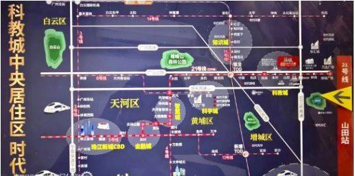 轨道交通方面,项目距离地铁21号线山田站C口约29米,属于典型的轨道上盖式住宅社区。21号线为广州东向发展主轴轨道之一,具有快线与普线双线运行模式,其中快线三站可达黄埔,六站可达天河核心区,通勤效率较高。