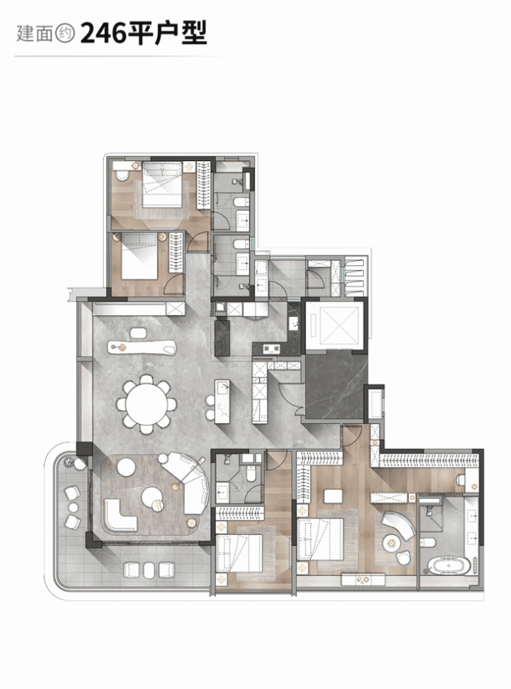 183㎡ 四房两厅三卫、205㎡ 四房两厅三卫、246㎡ 四房两厅四卫。