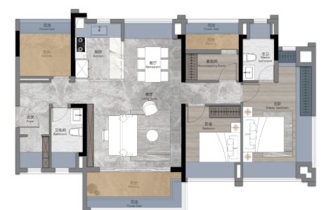 约102㎡四房两厅两卫:四开间东南向,豪宅级阳台,客厅超阔视野,主人房独立衣帽间。