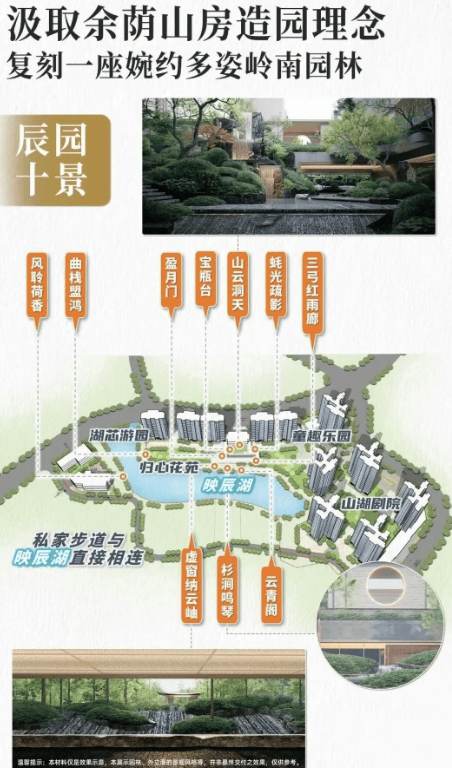 园林设计:汲取岭南园林“藏水于庭”的设计理念,结合余荫山房的造园手法,打造出独具特色的「辰园十景」。