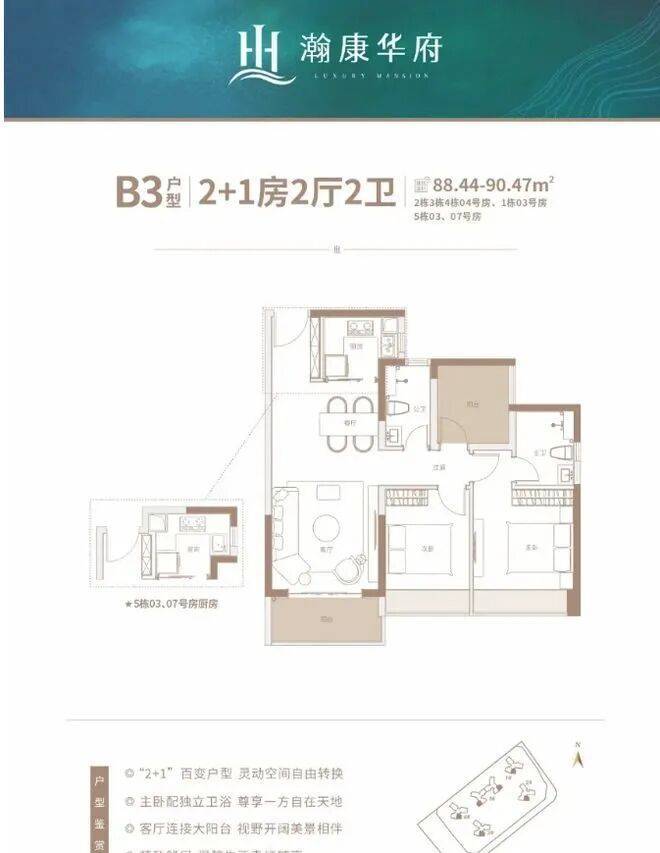 1栋03号房90平方米的精致2 + 1百变小三房:功能灵活,适合年轻家庭。