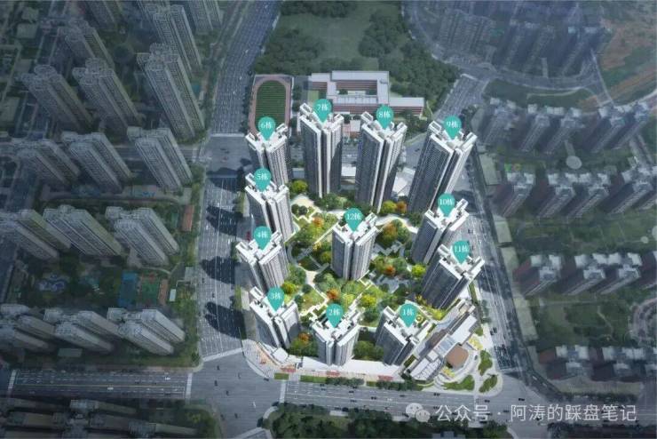 在社区规划上,项目采用点式布局,17 栋高层错落排布,保证几乎户户朝南,楼间距均在 50 米以上,最大楼间距达 60 米,既保障了每一户的采光与通风,又为社区留出了充足的园林空间。项目容积率仅 3.01,绿化率 30%,在高层住宅中属于低密宜居标准,居住舒适度远超区域同类型项目。