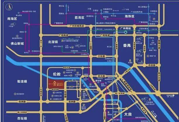 项目位于佛山市顺德区伦教新城区南苑西路与伦桂路交汇处,距离广珠轻轨顺德站仅约800米,乘坐轻轨2站即可抵达广州南站,1小时内可达珠海。佛山地铁3号线伦教站也在步行范围内,3站直达大良东乐路商圈,2站到北滘新城——这意味着无论是去广州上班、去顺德中心购物,还是周末带家人去长隆游玩,出行都相当顺畅。自驾方面,周边有105国道、广珠西高速、东新高速、佛山一环等4条纵向干道,配合龙洲路与南二环两条横向主干道,早高峰打车到佛山千灯湖片区平均耗时约25分钟。