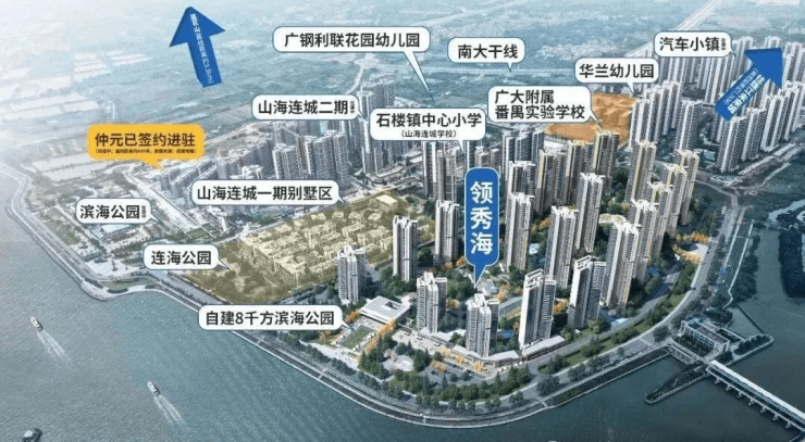 保利领秀海位于番禺莲花湾板块核心,东临珠江,西接南大干线,北靠大学城,南望狮子洋,是广深科创走廊与珠江景观带的交汇点。