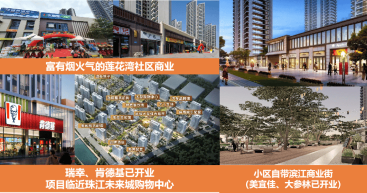 社区内部规划滨江商业街,配备便利店、美宜佳、大参林等基础商业设施,同时周边还有珠江未来城购物中心、亚运城广场、番禺天河城、番禺万达等成熟商圈,实现一站式购物体验。小区商业配套满足日常生活需求,而大型购物娱乐则可依托周边成熟商业网络。