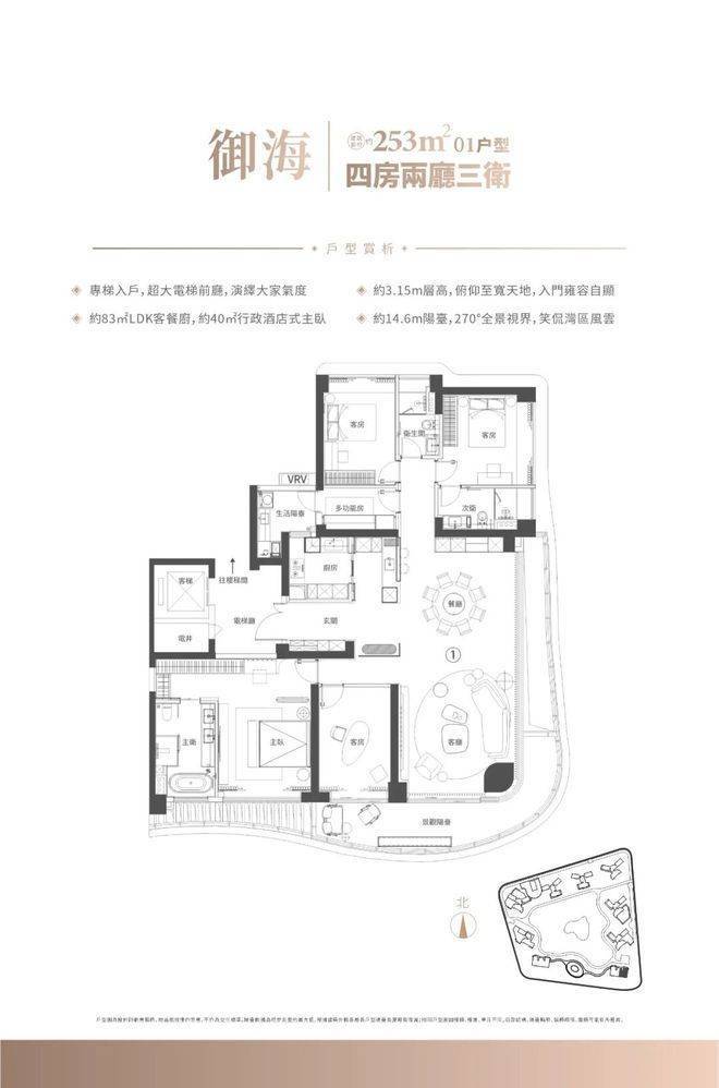 户型涵盖约 110 - 253㎡的三至四房,满足不同家庭结构的高端居住需求。110㎡三房两厅两卫户型精巧实用,空间布局合理,功能分区明确,适合追求品质生活的小家庭。140㎡四房两厅两卫户型宽敞舒适,能为家庭成员提供更充裕的生活空间,满足家庭成长需求。253㎡四房两厅三卫户型则尽显奢华,空间开阔,布局大气,为追求极致居住体验的家庭提供尊贵享受。大部分户型南向直面大海,让业主在家中就能饱览一线海天盛景。