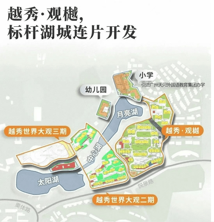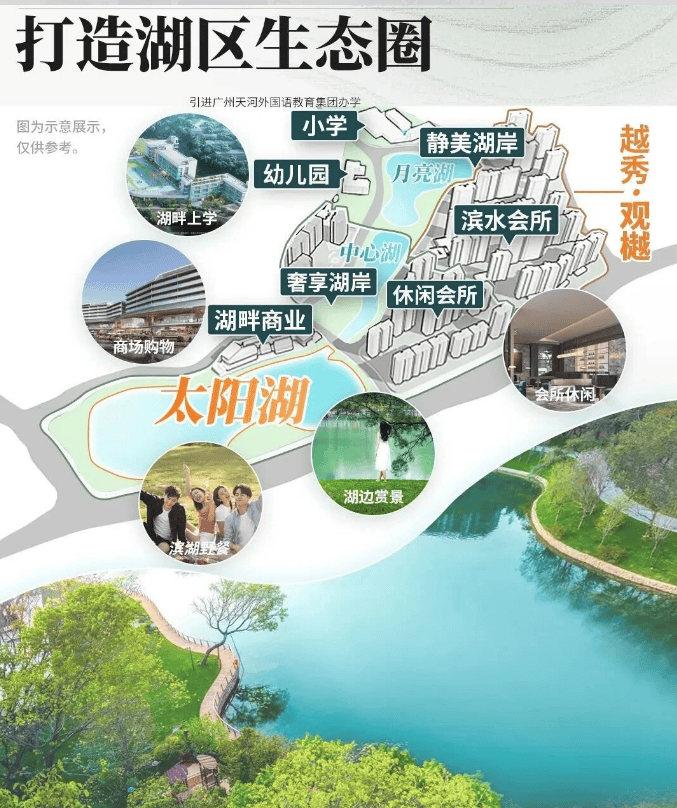 生态优先,绿色发展 越秀观樾所在的片区曾是工业用地或闲置用地,越秀在开发过程中高度重视生态修复。项目一期在湖水净化、环境改造等方面下了大功夫,不仅恢复了月亮湖和太阳湖的自然生态,还构建了完善的滨湖商业体系。这种“先生态、后居住”的开发理念,展现了国企的社会责任感和长远眼光,也为未来的社区环境奠定了坚实基础。