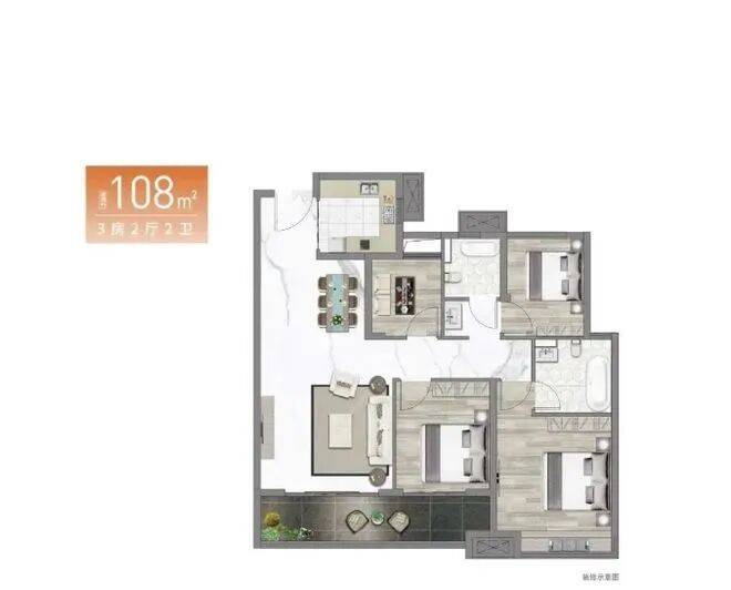 108㎡ “3 + 1” 房:专为二胎时代或三世同堂家庭设计,一步到位满足家庭居住需求。6.8米景观大阳台,视野开阔,主卧配备独立衣帽间,彰显品质生活。