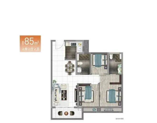 85㎡ “2 + 1” 房:客厅开间3.4米,阔绰大气,4.1米长的阳台让空间开阔通透,营造出百平大户型的尺度与采光效果。