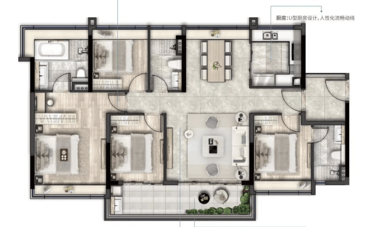 空间设计:LDK一体化瞰江客厅,主卧套房配独立衣帽间;