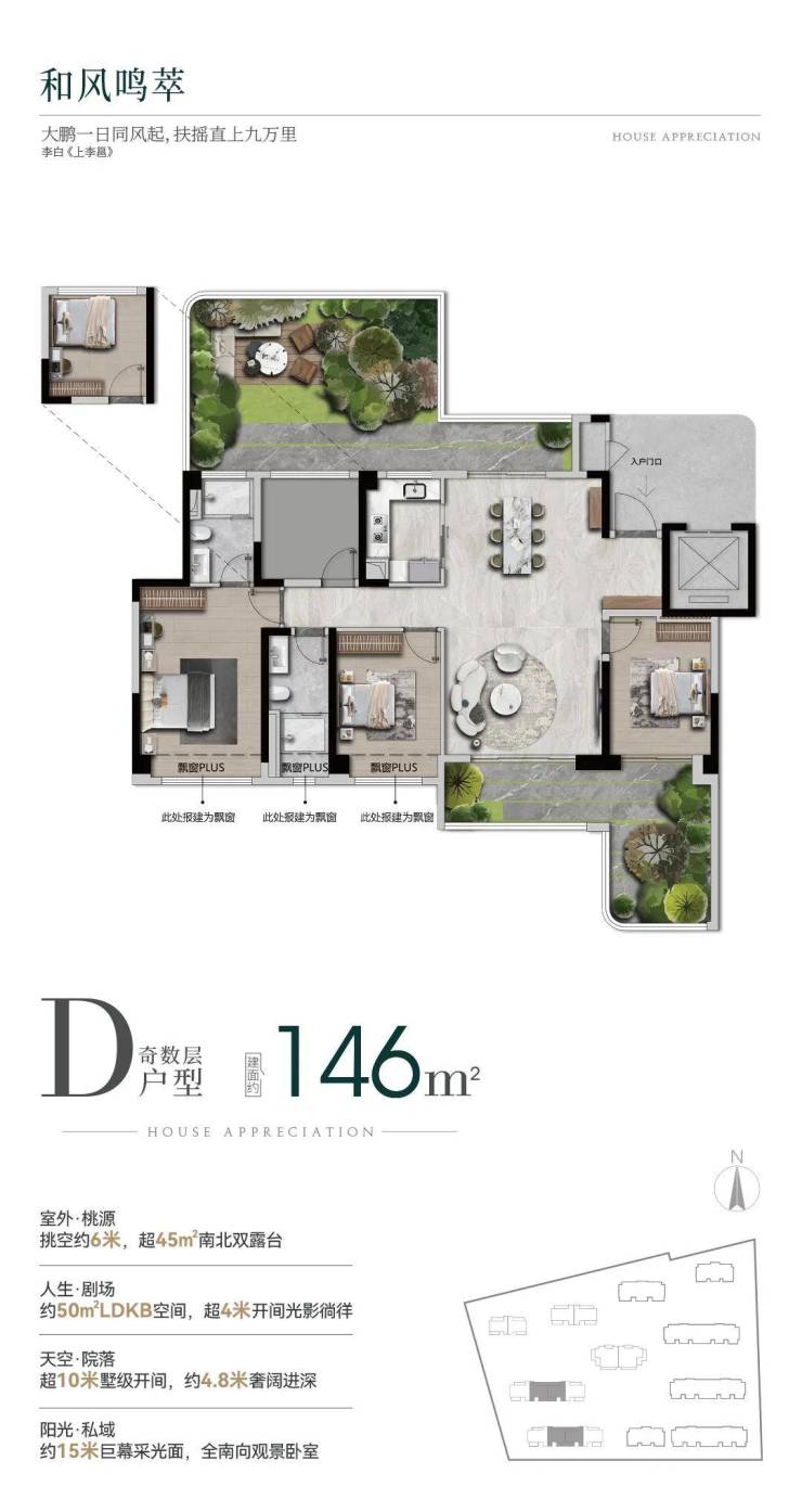 一个值得关注的细节是“超120%实用率”。这得益于挑空约6米、进深超4米的天空院设计,以及阳台、露台等半赠送面积的合理利用。以建面约178㎡的样板间为例,南向主卧外接6米长观景露台,北侧餐厅旁另设生活阳台,形成“南北双露台”格局。业主可根据季节变换用途:春天种花、夏天烧烤、秋天晾晒、冬天晒太阳,真正实现“72变生活场”。