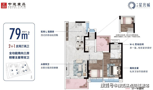 79㎡南向三房两卫:四开间朝南,U型厨房+餐客一体化设计,主卧带独立卫生间,实测使用面积达73㎡。
