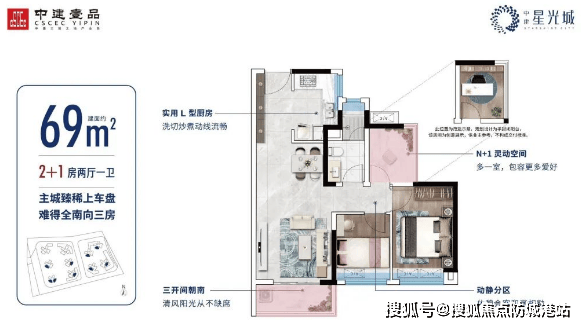 69㎡全南向三房:三开间朝南,总价相对较低,适合首次置业者,实测使用面积达64㎡(市场同面积户型仅56㎡)。