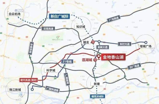 交通方面,金地香山湖通过穗深城轨荔湖城站实现与城市核心区的无缝衔接,该站位于新白广段,可在一站内换乘广州地铁21号线,三站即可直达天河核心区,快速通达广州白云机场与深圳宝安机场。社区周边道路交通同样便捷,花莞高速、增天高速双高速出入口近在咫尺,同时新新大道、广园快速路和广汕快速路构成“四横四纵”城市快速交通网,为业主出行提供极大便利,兼顾城市与湾区的生活半径。