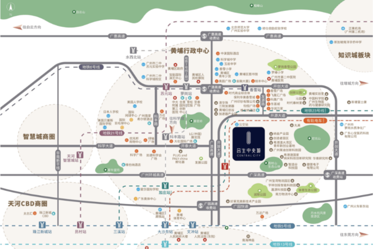项目位于科丰路与开创大道十字路口,这是黄埔科学城的“原点”。不同于南沙、增城需要漫长的兑现周期,这里是已经成熟的城市核心区。半径1公里内聚集了黄埔区政府、广州开发区管委会等政务中心,以及雪松总部、多益网络等世界500强及上市企业总部。这里的土地价值,是由实实在在的产业税收和人口密度支撑的,而非概念炒作。