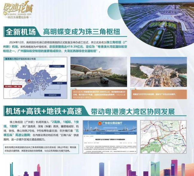 机场潜力:占据空港经济区域,珠三角枢纽机场选址高明,作为广东省重点打造的 “5 + 4” 骨干机场之一,总投资额高达 419.39 亿元,将建设 120 万平方米航站楼,规模与广州白云机场看齐,满足年旅客吞吐量 6000 - 8000 万人次、年货邮吞吐量 220 万吨。未来机场建成,将极大提升区域交通便利性与经济活力,为居民商务出行、旅游等带来便捷。