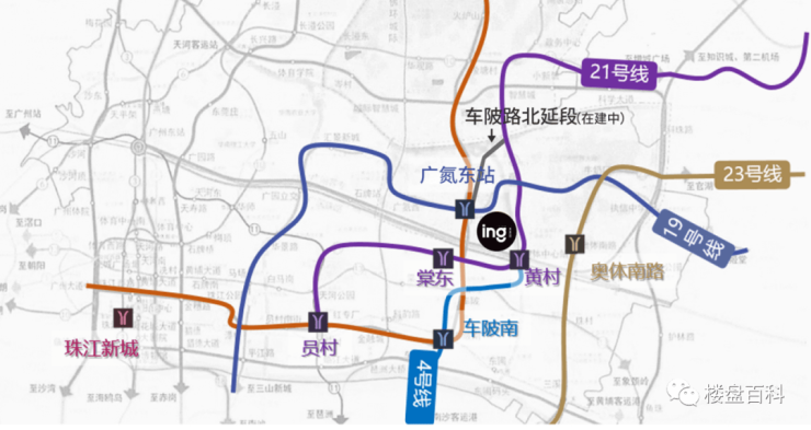 地铁——四地铁环绕,21 号线+4 号线黄村站已开通,步行约 15 分钟,4 站达珠江新城。19 号线+30 号线广氮东站规划中,距离项目 280 米。