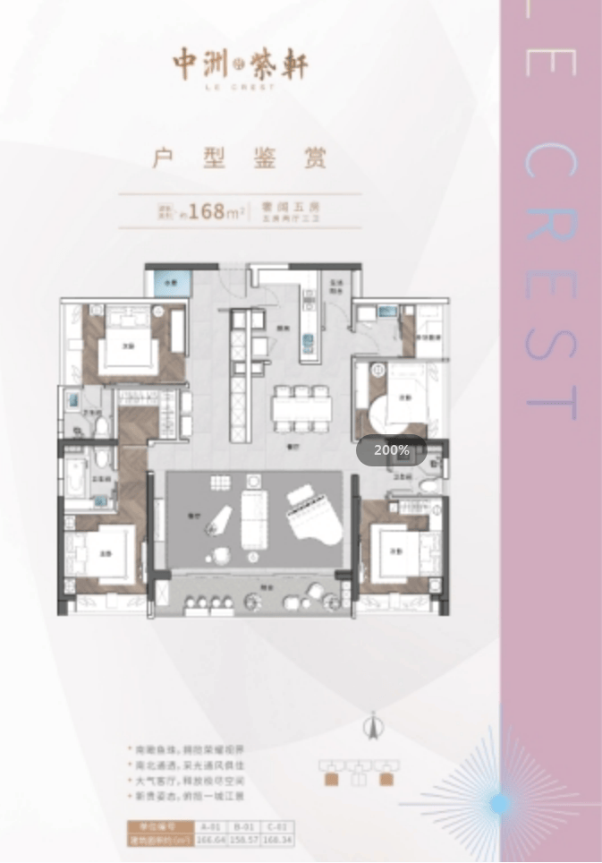 追求更大居住空间的改善型购房者可以考虑161-171㎡的五房两厅三卫户型。该户型三开间朝南,保证了充足的采光。客厅宽敞,搭配开放式厨房,让空间更显开阔,家人在烹饪时也能与客厅里的人互动交流。主卧空间宽敞,不仅有独立卫生间,还能打造一个小型衣帽间,收纳功能强大。